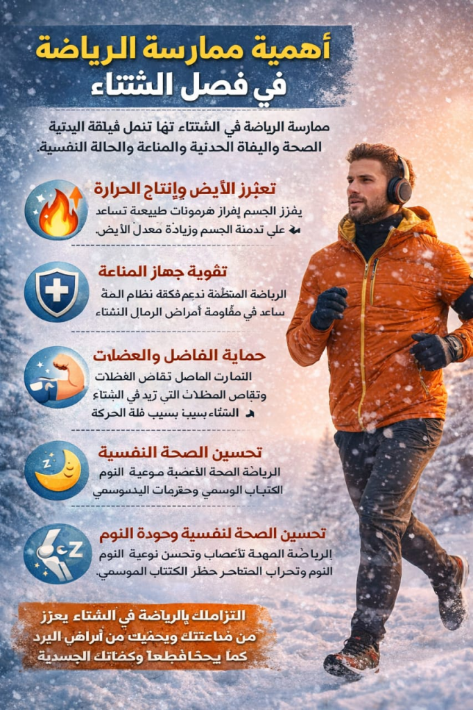 الرياضة في الشتاء ليست رفاهية، بل ضرورة للحفاظ على الصحة البدنية والنفسية. الالتزام بالتمارين المعتدلة إلى المكثفة بحسب القدرة البدنية يضمن حماية الجسم من الأمراض الموسمية، ويعزز من لياقته وكفاءته على مدار العام.