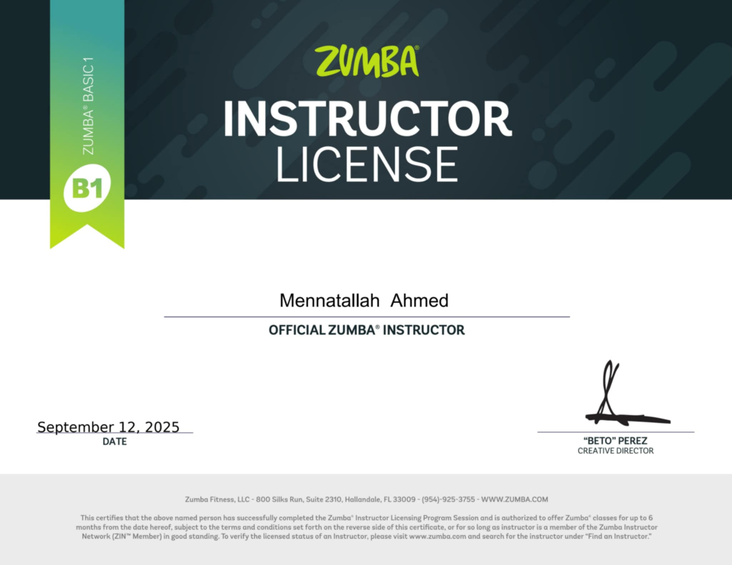 Zumba instructor معتمد من Zumba Fitness, LLC is recognized by each of the following organizations as an approved Continuing Education Provider: AMERICAN COUNCIL ON EXERCISE® (ACE) ATHLETICS AND FITNESS ASSOCIATION OF AMERICA® (AFAA) THE AQUATIC EXERCISE ASSOCIATION® (AEA) CANFITPRO® AUSACTIVE REPS NEW ZEALAND EMD UK Brown degree in Kung Fu معتمد من الاتحاد المصري للكونغ فو وشوو و حاليا بحضر ماستر فالتدريب الرياضي حصلت على العديد من البطولات المحلية من سن ١٠ سنوات حتى سن ٢٤ سنه في رياضة الكونغ فو اساليب من المركز الاول الثالث و حصلت مؤخرا على بطولة الجمهورية المروحي في رياضة التايكوندو و كان المركز الأول و حاليا استعد لبطولة كأس مصر للكروجي لرياضة التايكوندو انا أمارس الرياضة منذ كان سنتين ونصف مثل رياضة الجمباز ، البالية ، الكرة الطائرة ، و العديد من الرياضات الاخرى شاركت في العديد من البطولات وايضا شاركت في بعض العروض الدولية مثل افتتاح كاس الامم الأفريقية لكرة القدم الرياضة بشكل عام هي تطور و للواحد و تفريغ لطاقة و فنفس الوقت لتحافظ على صحة الواحد ولياقة مؤخرا بقى عندنا الواعي الكافي اننا لازم نحافظ على لياقتنا وصفتنا مش بس كهدف نزول وزني بس كمان عشان نقدر نكمل حياتنا بطريقة صحية وسليمة .. كتير يقابل حالات من سن ٦٠ سنه و بدأوا أنهم يمارسوا الرياضة و حرفيا ده فرق معاهم مش من الناحية الصحيه بس لا ده حفزهم من الناحية النفسية وكمان قلل اعراض كتير من امراض الشيخوخه و و ضعف العظام والعضلات فالمرحله ودي حاجه بتشجعني اني تواصل وأكمل نشر الوعي و ثقافة الرياضة ، لأنها كنز مهما كان عمرك أو نفسيتك أو وضعك محفظتك على الرياضة بتخلي الدنيا من حوليك تتحرك وتمشي و تحسسك كانك فعلا طاير و ديما لازم تفتكر أن العقل السليم في الجسم السليم