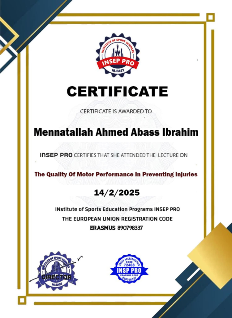 حصلت على شهادات في Physical preparation and planning of training loads Sports and medical massage Sports injuries Advanced curas in Sports injuries The Quality of motor performance in preventing injuries من معهد insp pro معتمد من الاتحاد الدولي الأوروبي و Ereps And Erasmus