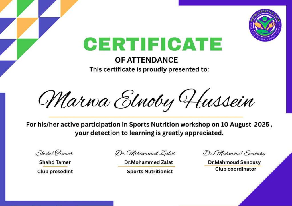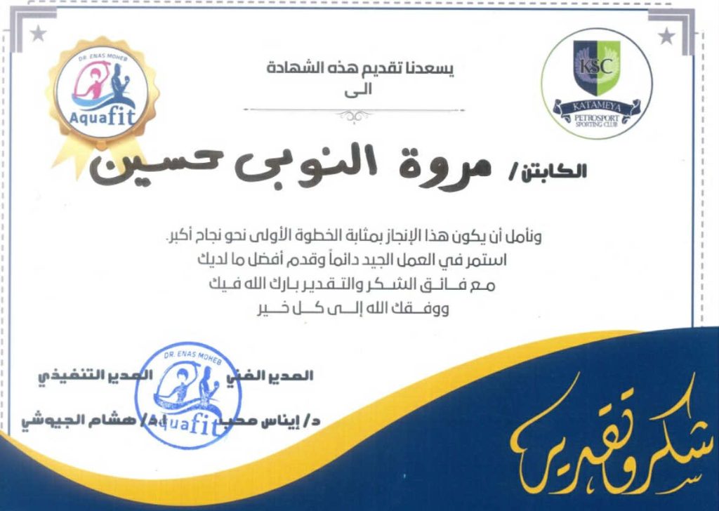 كما قدمت كابتن مروة النوبي حصص يوجا في نادي بتروسبورت – القطامية بالتجمع الخامس، وتم تكريمها بشهادة تقدير عن مجهودها وتعليمها اليوجا بشغف🩵
