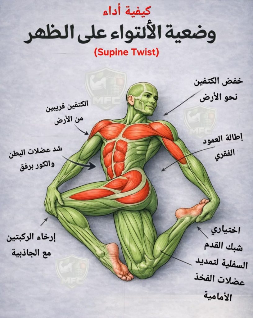 …بس تأثيرها على جسمك وراحة ضهرك رهيب جدًا 👌✨ ليه الوضعية دي مهمة؟✅ بتخفف وجع أسفل الضهر والعمود الفقري✅ بتفك شد العضلات بعد التمرين أو بعد يوم طويل مرهق✅ بتحسن مرونة العمود الفقري وبتخليه يتحرك بسهولة✅ بتنشط الهضم وبتساعد تقلل الانتفاخ والنفخة✅ بتهدي الأعصاب وبتقلل التوتر والضغط النفسي✅ ممتازة قبل النوم… بتدخل الجسم في حالة استرخاء عميق 😌🌙✅ بتقوي عضلات الكور بشكل خفيف من غير أي ضغط أو إجهاد💡 نصيحة ذهبية:خد نفس عميق… وخلي الحركة هادية وناعمةالوضعية دي هدفها الراحة والاسترخاء مش القوة 💚